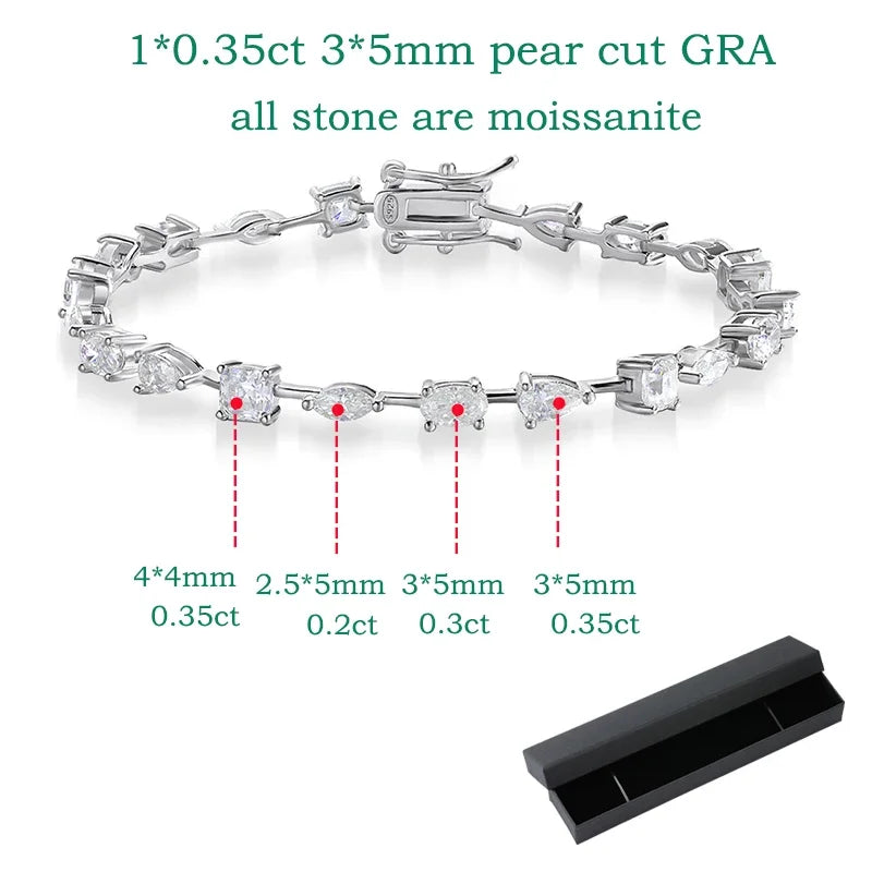 Each bracelet features pear-cut D-color moissanite stones with VVS1 clarity and an excellent cut grade. These high-quality stones are meticulously selected to offer diamond-like brilliance, fire, and durability. Designed to pass stand