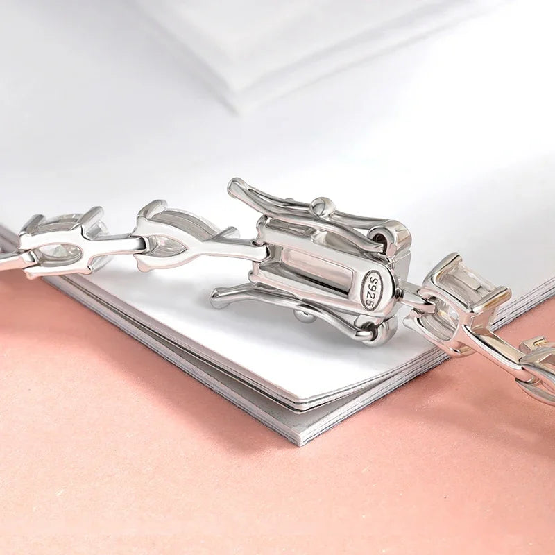 Made from solid S925 sterling silver and plated with radiant 18K white gold, the bracelet is protected with advanced AF technology to resist tarnishing and maintain its luster. Every stone is hand-set into a trendy geometric pattern that enhances light reflection for maximum sparkle.