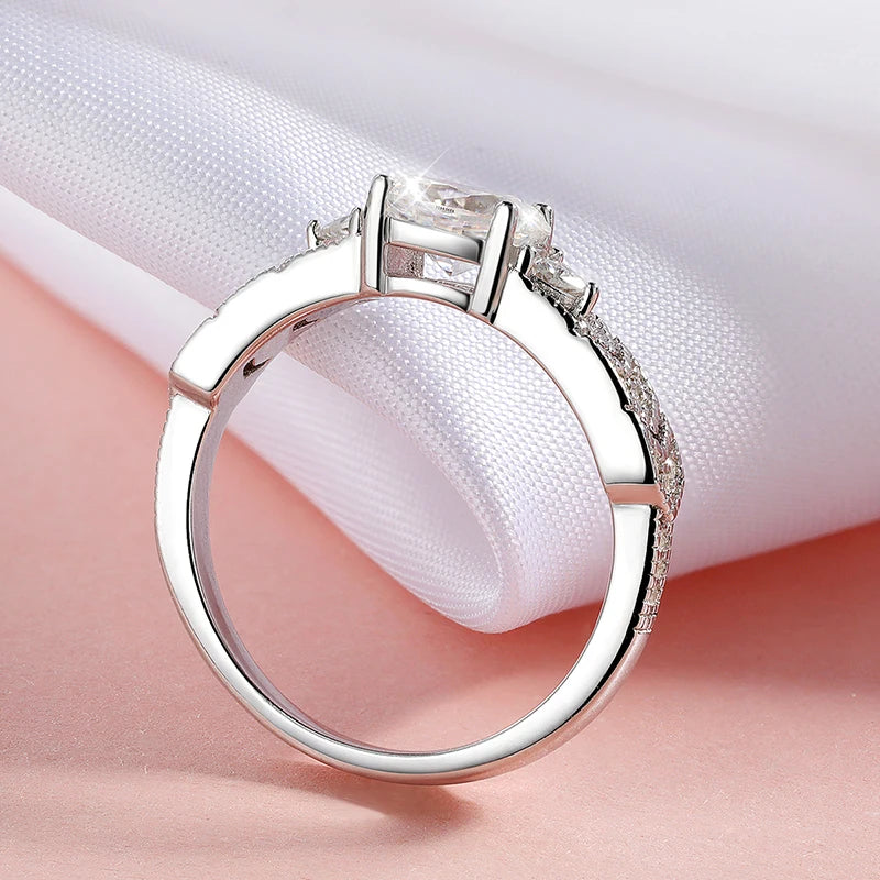 This ring showcases a 5×7mm center stone with all surrounding stones made of real moissanite. Each gem is graded D color and VVS1 clarity, ensuring a flawless, colorless sparkle that rivals the finest diamonds. All stones pass standard diamond testers for guaranteed brilliance.