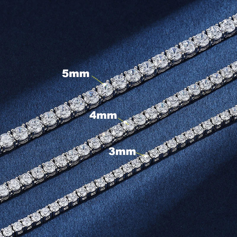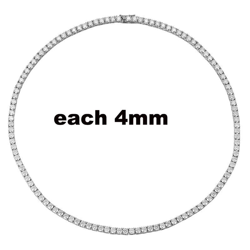 This necklace is set with a continuous stream of round brilliant-cut moissanite stones in your choice of size, 2.5mm to 6.5mm, designed to radiate intense fire and sparkle. Each stone is D-color and VVS clarity, offering a near-flawless finish and maximum brilliance. Every piece passes the diamond tester for authenticity in both look and feel.