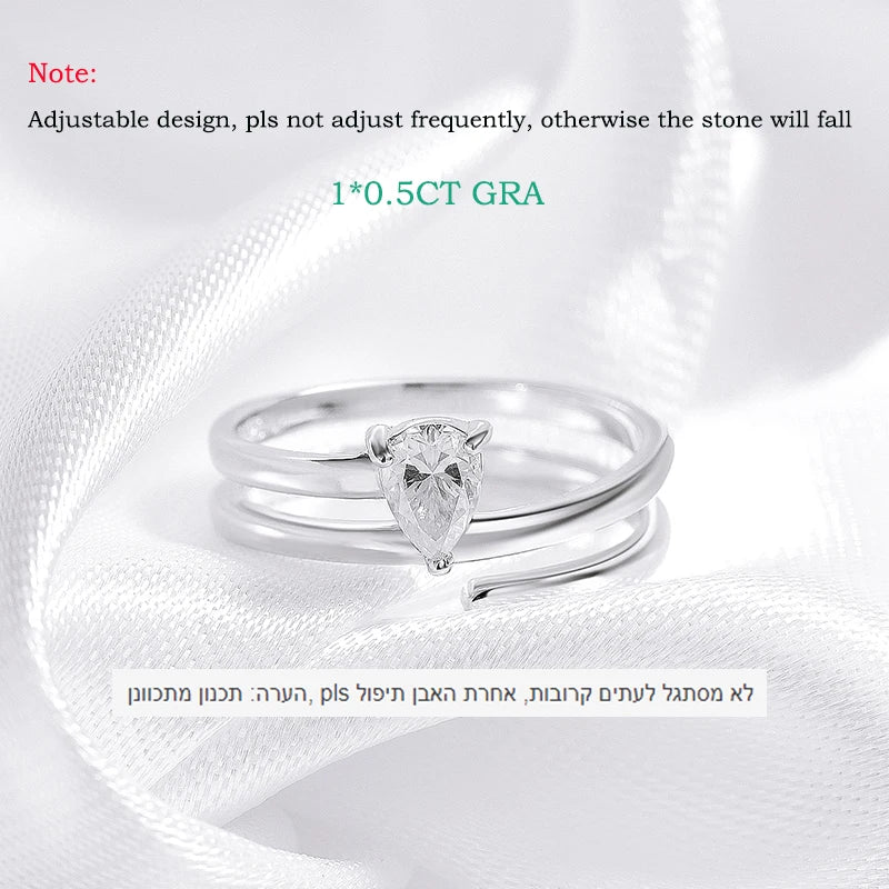 You’ll receive one pear-cut 0.5CT (4x6mm) solitaire moissanite ring made of 100% S925 sterling silver with 18K gold plating. The ring comes with a third-party GRA certificate and is packaged in a luxury gift box. Available in ring sizes 4–12.